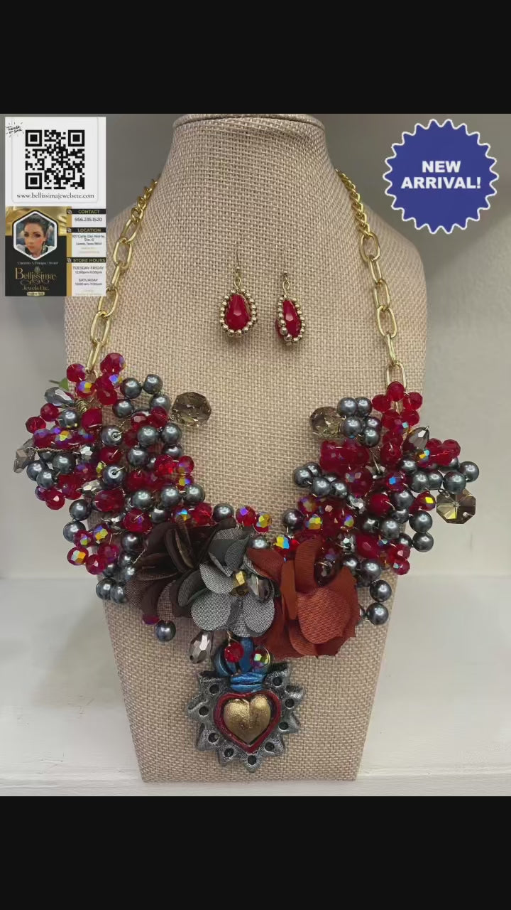 This beautiful crystals necklace set was wonderfully handmade with a large multicolored heart pendant. This necklace bib is set on a paperclip chain and the colors meld together gorgeously; silver, red, gold, royal blue, and copper. You won’t regret having purchased this rare beauty, it’s a must have!