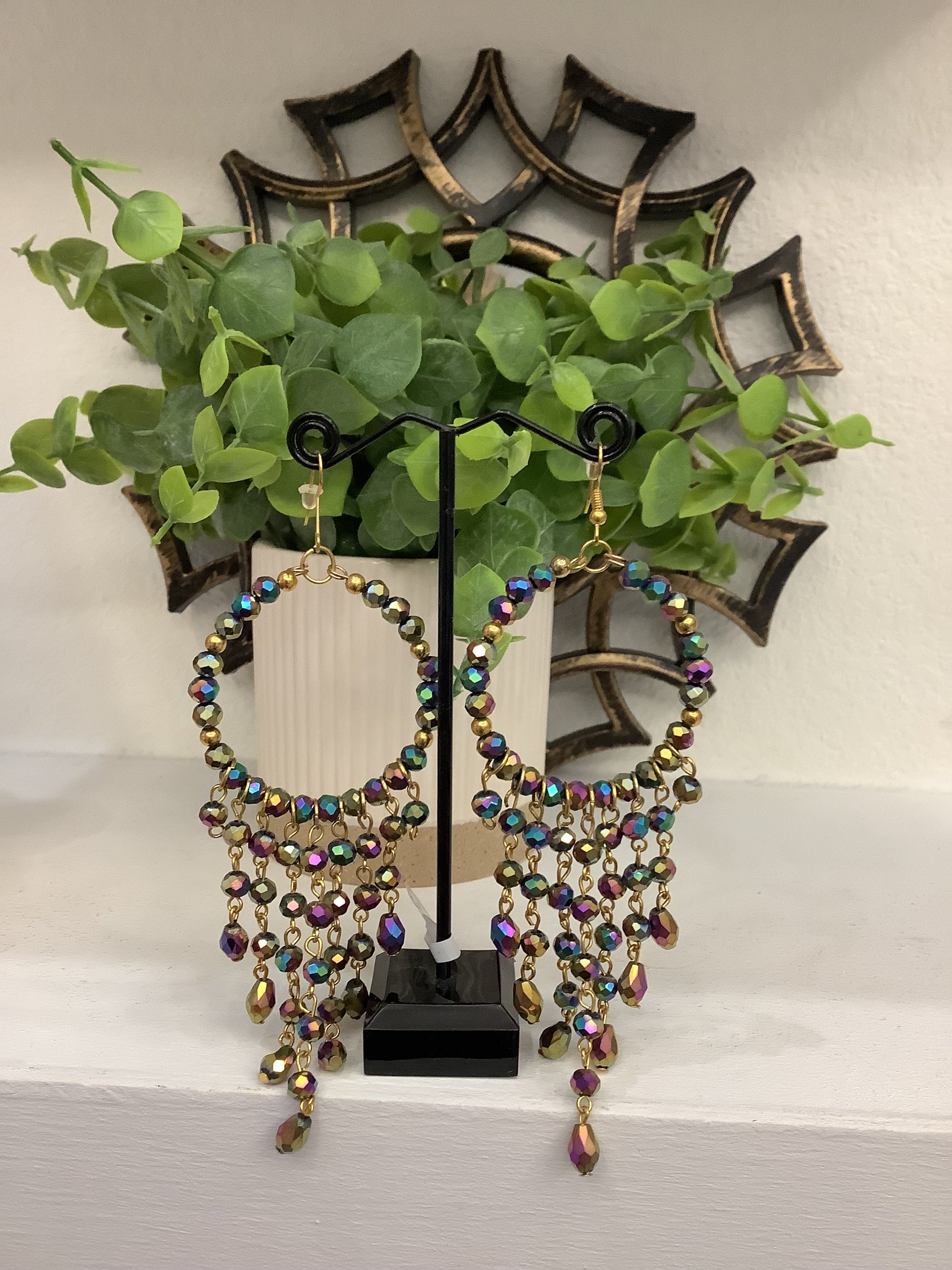 These earrings go perfectly with any of our multi-colored necklaces. They are handmade, for pierced ears, light weight, in purple, green, and copper colored beads.