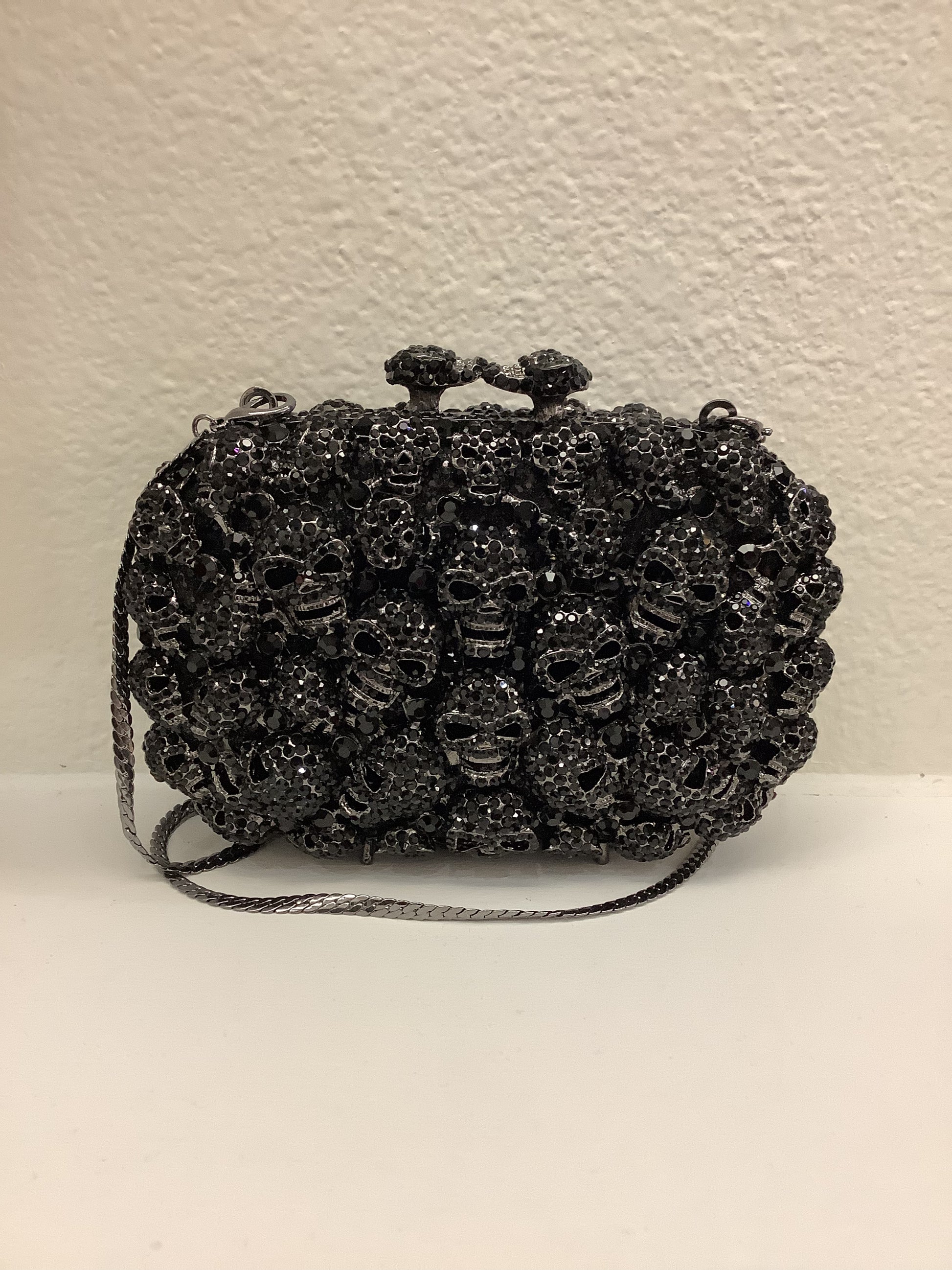 Turn heads and make a bold statement with this captivating black crystal clutch. Perfect for the fashionista who loves a touch of the dramatic, this beautiful clutch is completely covered in a dense, shimmering array of skull motifs created from hundreds of handset black rhinestones.