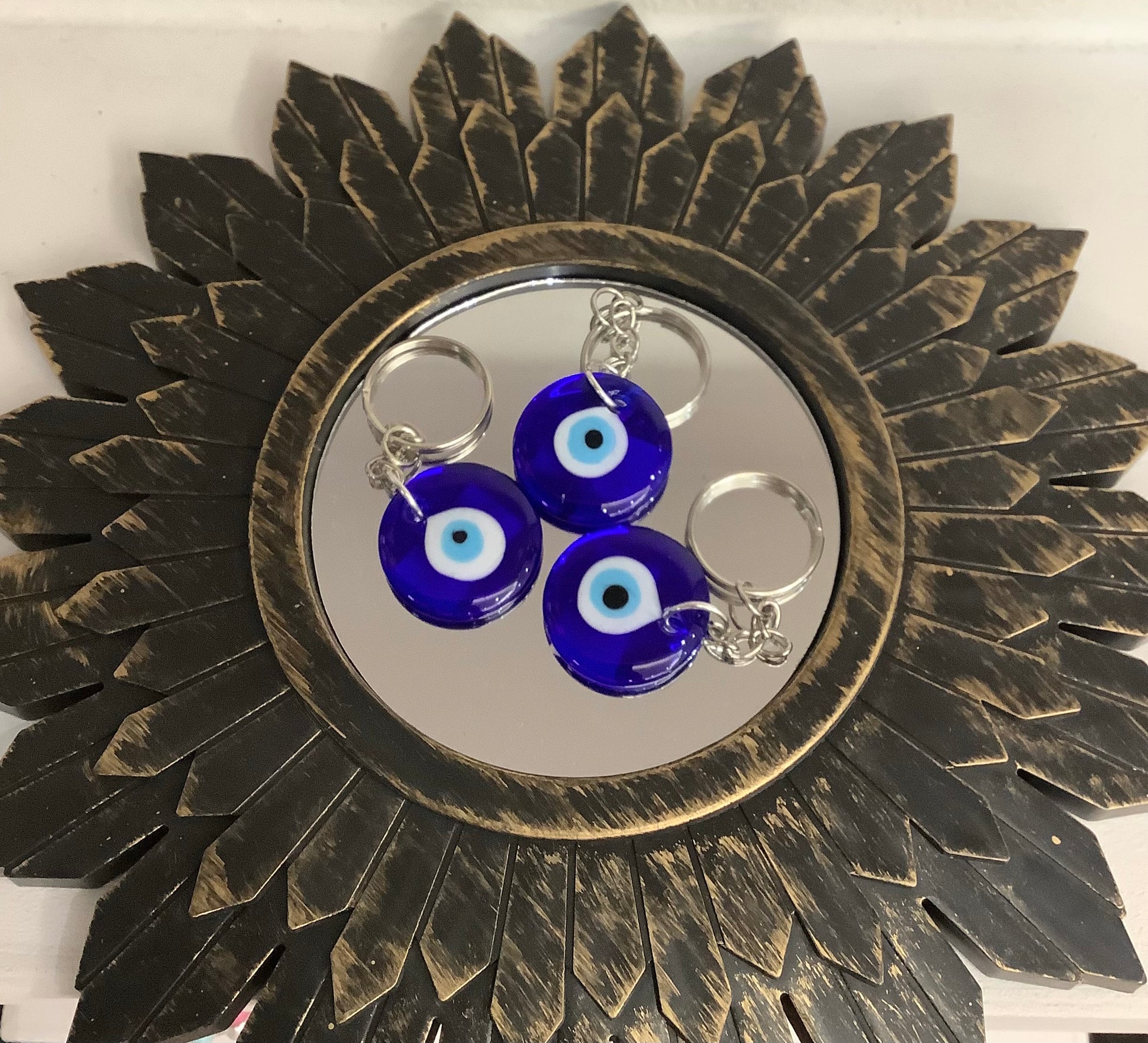 This blue Turkish Evil Eye 🧿 glass pendant keychain is the perfect accessory to complete your look. The blue Turkish evil eye is a powerful amulet to ward off negative energy and bad luck. The primary function of this amulet is to act as a shield against negative energy, ill intentions, and envious glares that are believed to bring harm. Carry your keys with style without breaking the bank.