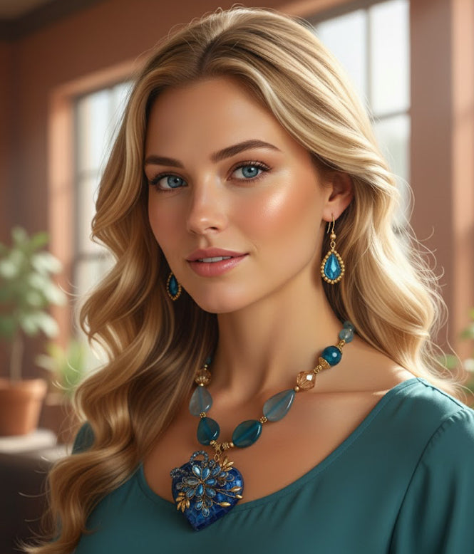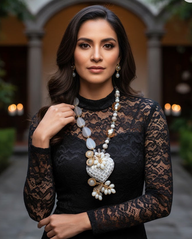 These exquisitely ornate handmade set of jewels come with the matching earrings, and in a variety of colors. The pendant is made of colored ceramic with encrusted colored glass, creating a mosaic piece of art in the shape of a heart. The necklace is made of colored gemstones that compliment the color of the pendant. If you’re looking for a statement necklace set, look no further. Buy it in your favorite color today.