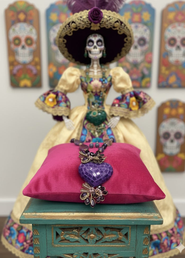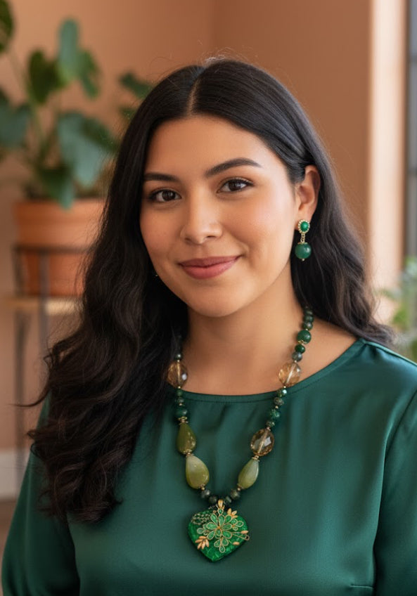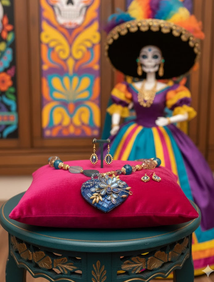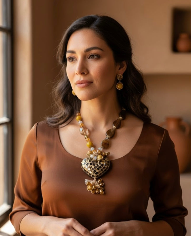 Ornate Handmade Artisan Mosaic Heart and Gemstones Necklace Set w/ Matching Earrings (18” long + 2”extender)