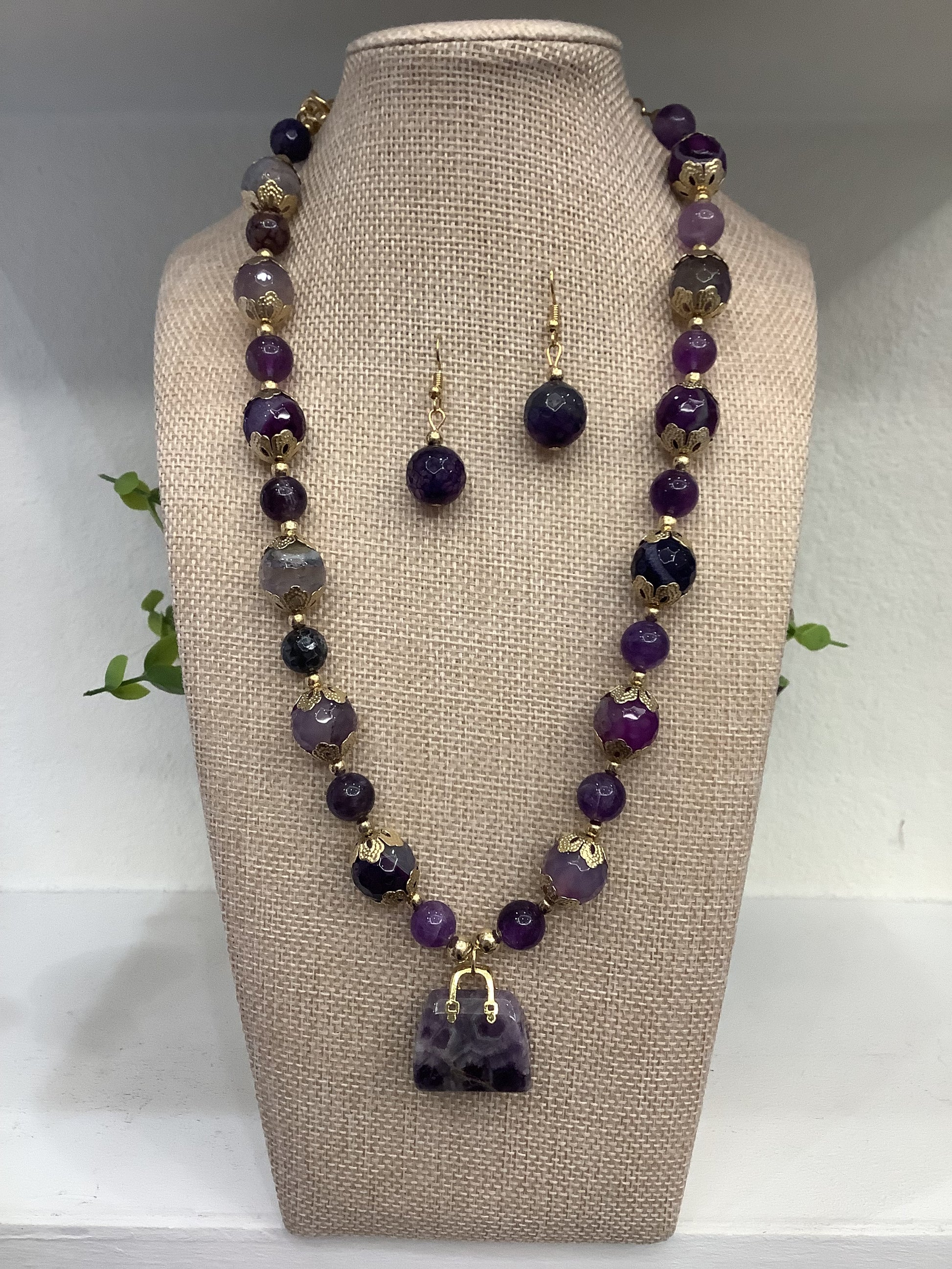 Agate Gemstones Handmade Artisan Necklace Set w/ Matching Earrings (18” long + 2”extender)