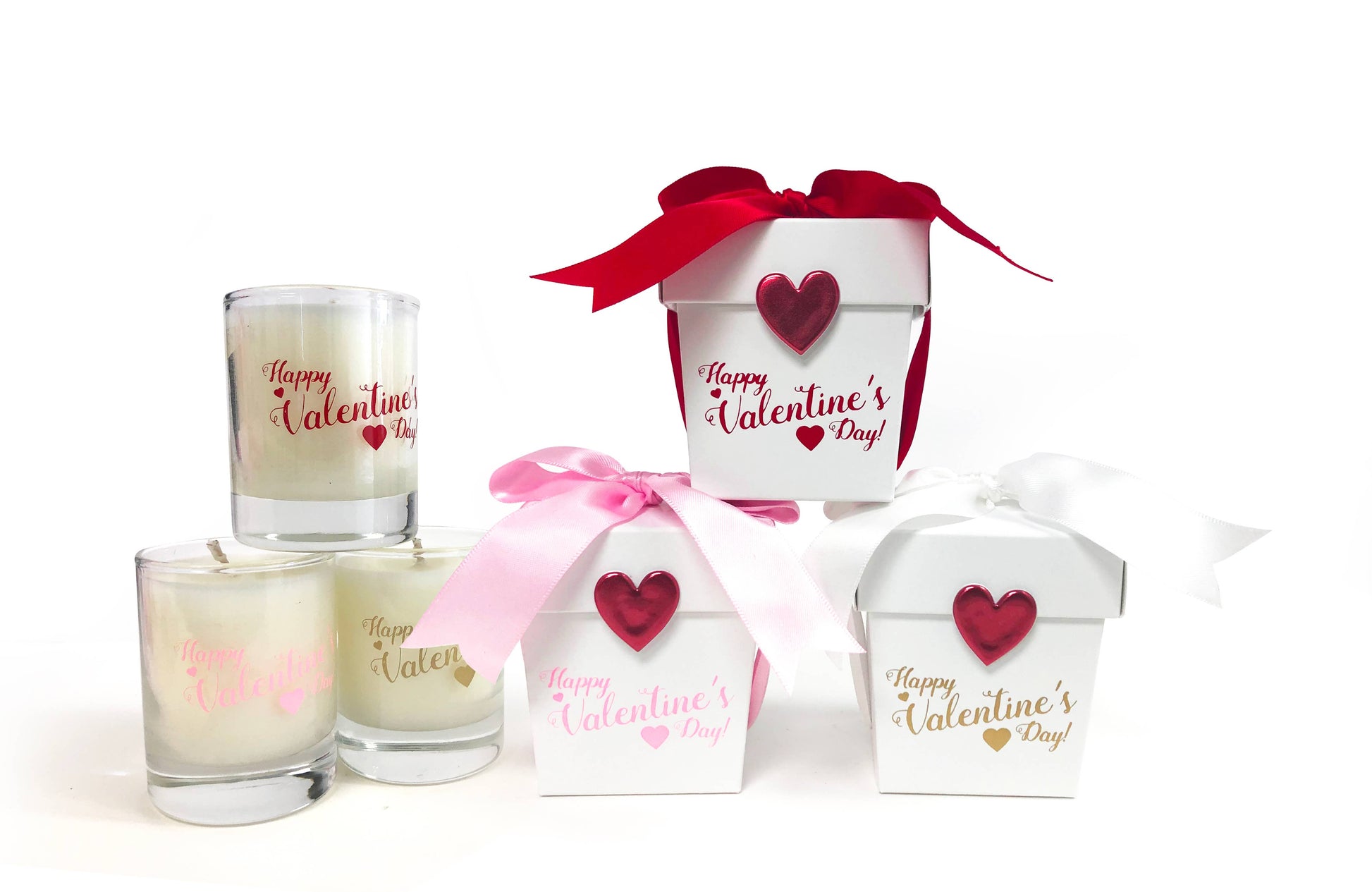 Each candle is made of hand-poured soy blend wax in a 2 oz clear glass and is housed in a white mini box with three different bow colors and heart appliqué, ready to gift 🎁 .