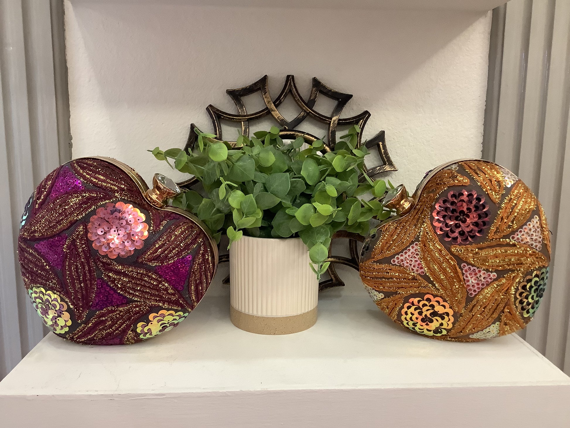 This clutch is a true work of art and the perfect accessory to add a pop of glamorous texture and sparkle to any formal outfit, cocktail dress, or evening wear. The unique heart-shape and dazzling handiwork make it more than just a bag—it's a conversation starter.